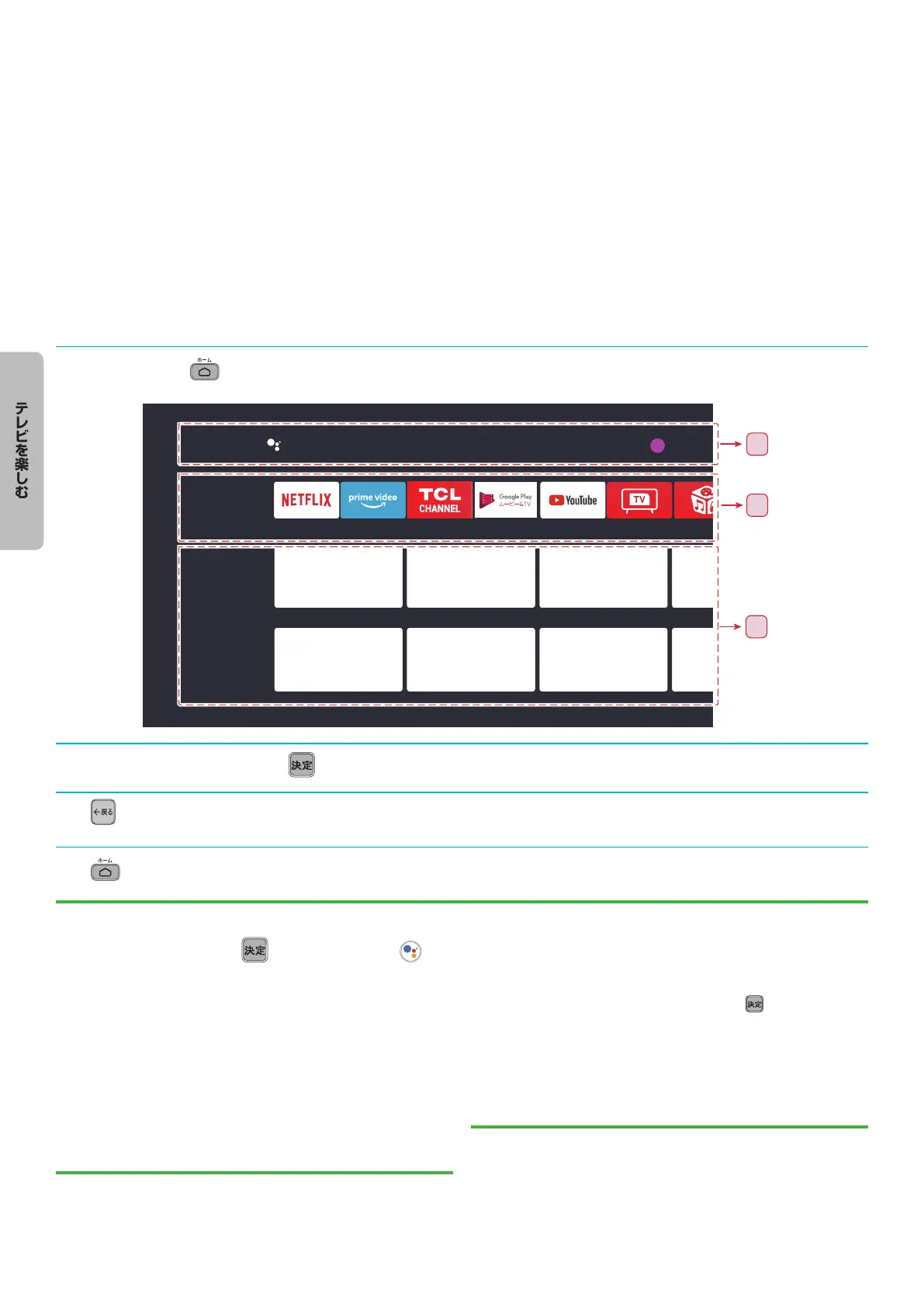 ●● Google●テレビのホームページでは、音声またはリモコン操作による入力によってコンテンツを検索したり、おすすめ、映画、