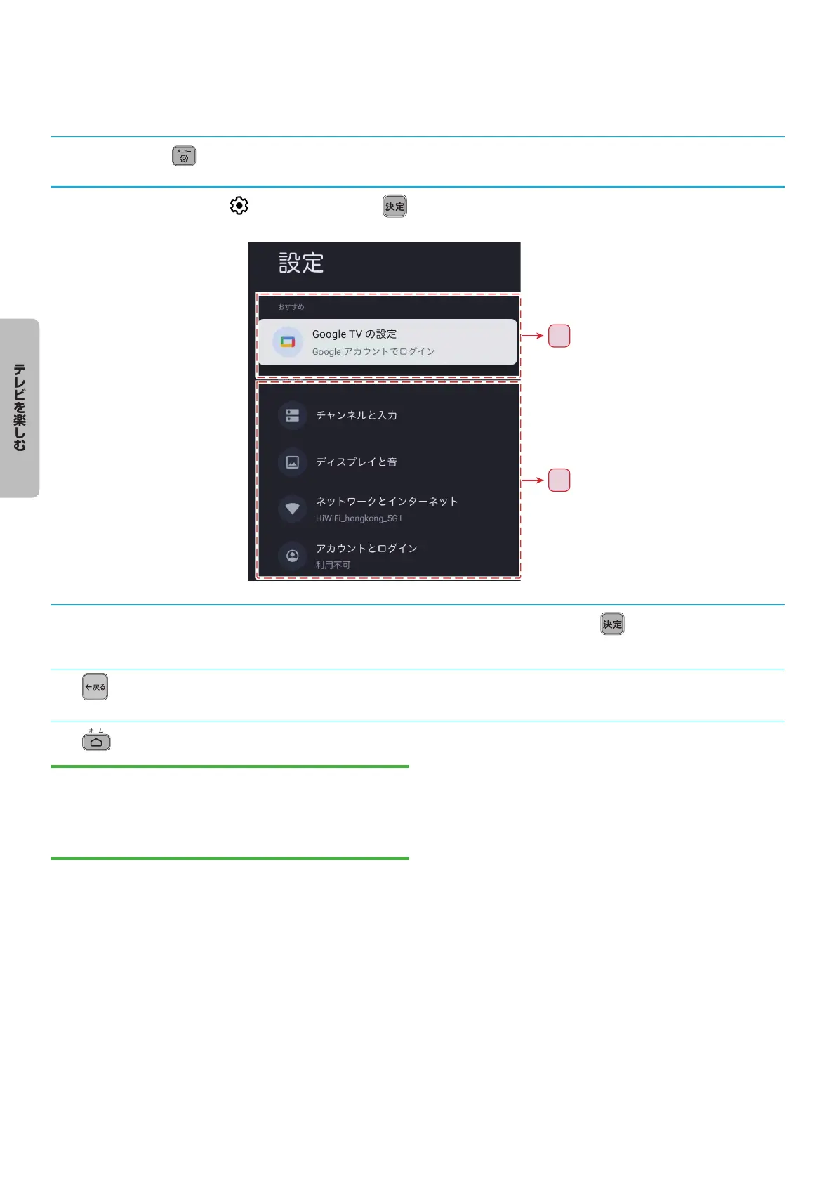 ●● ネットワーク、アカウント、アプリ、デバイス設定、リモコン、アクセサリなどのスマート TV 機能に対する設定を行います。