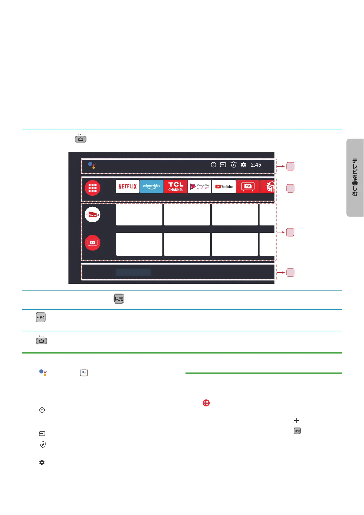 ●● スマートテレビのホームページでは、音声または入力によってコンテンツを検索し、入力方法、アプリ、チャンネル、その