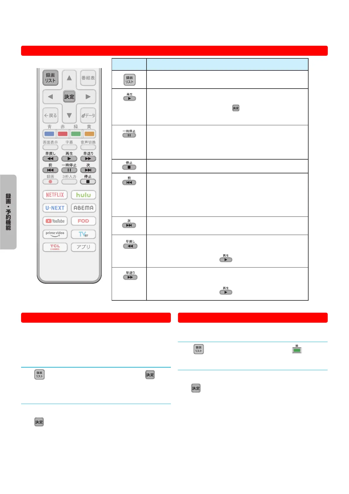 ● 再生中またはテレビ番組の視聴中に押すと、録画リストが