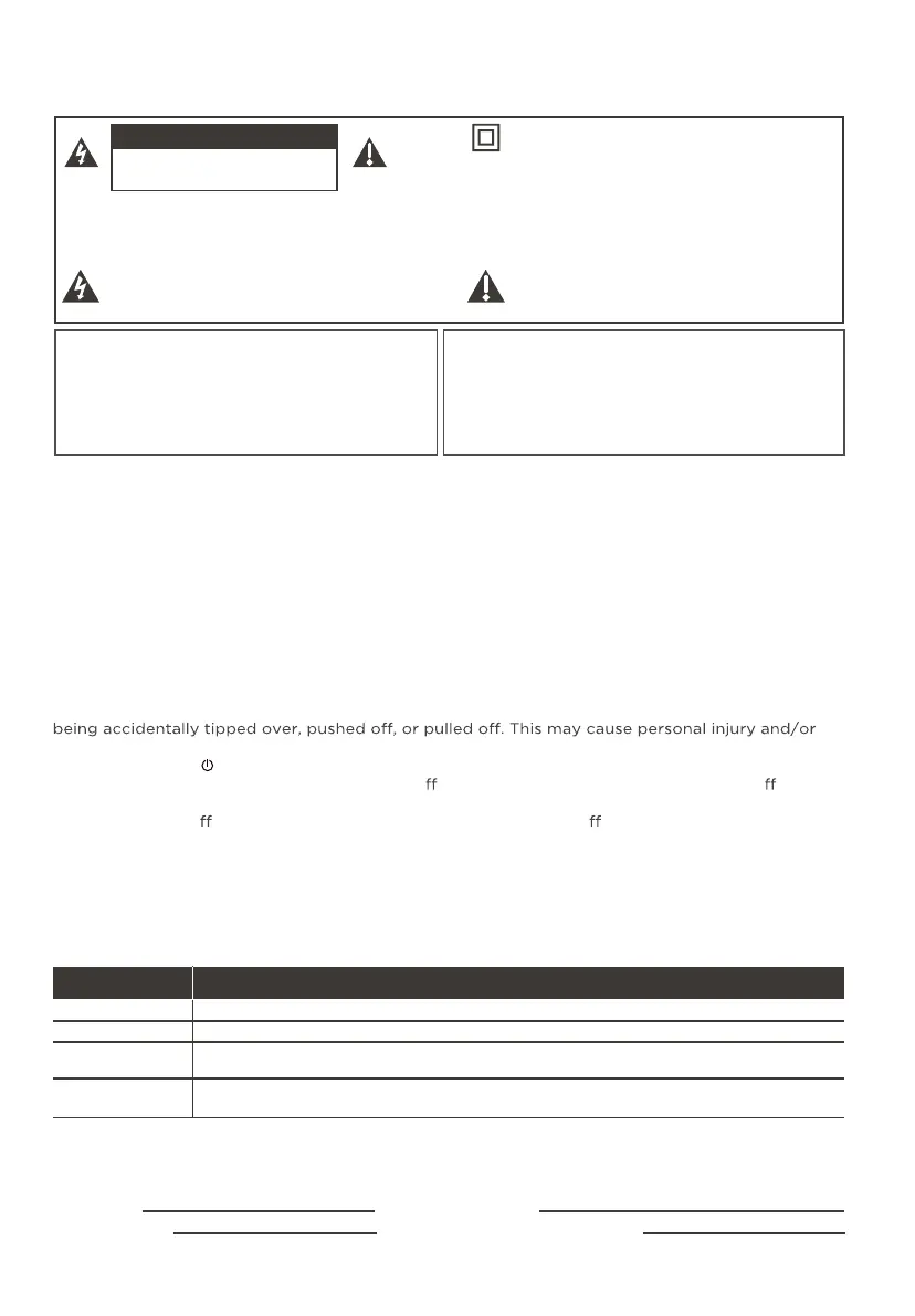 Make sure the TV stand or base you use is of adequate size and strength to prevent the TV from