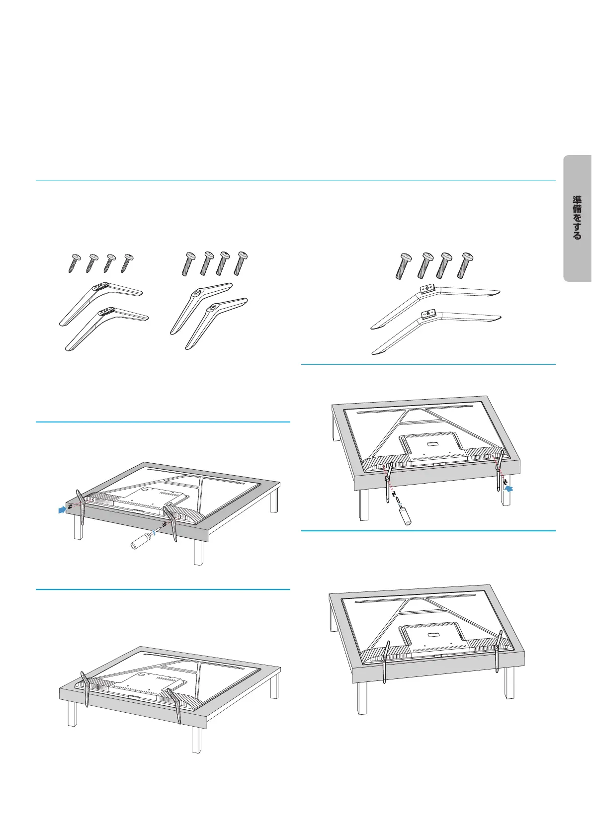 ●● 組立中に画面に傷がつかないよう、画面の下に軟らかい布などを置くようにしてください。