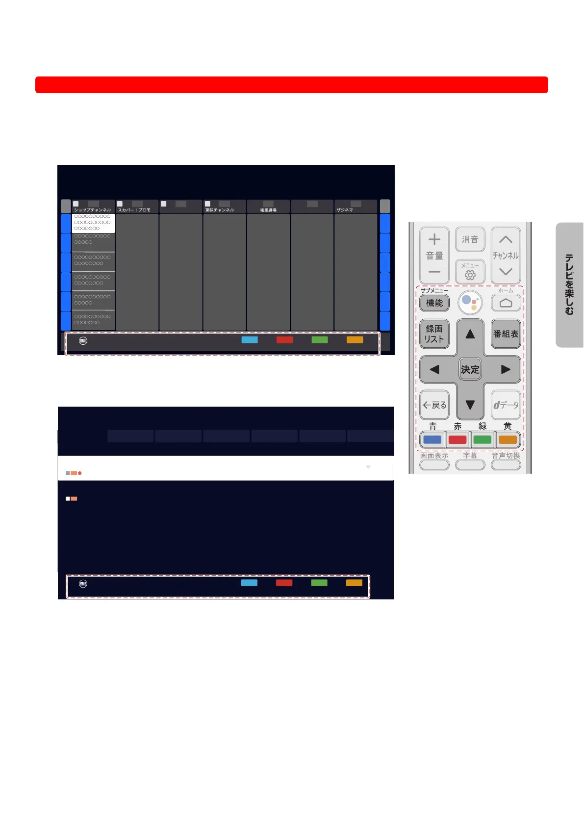 ● 番組表などのメニュー画面の下部には、そのときに使用できる(または使用する)リモコンボタンの操作ガイドが表示され
