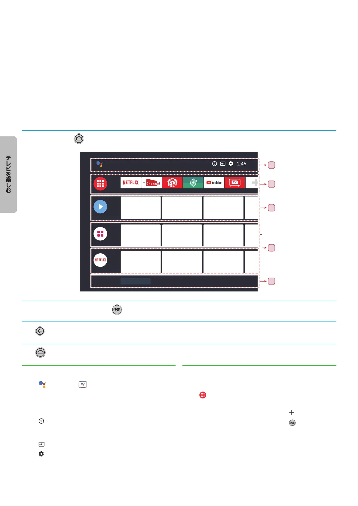 ●● スマートテレビのホームページでは、音声または入力によってコンテンツを検索し、入力方法、アプリ、チャンネル、その