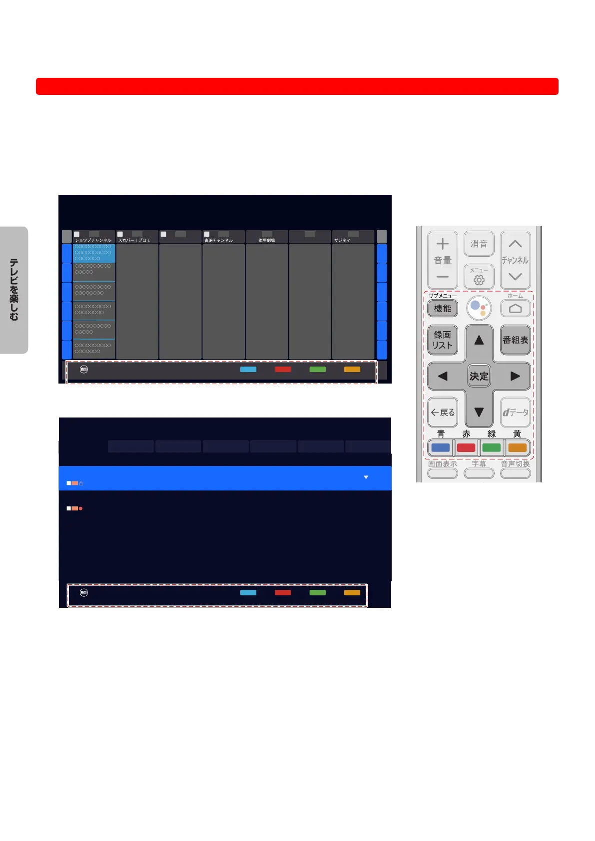 ●● 番組表などのメニュー画面の下部には、そのときに使用できる(または使用する)リモコンボタンの操作ガイドが表示され
