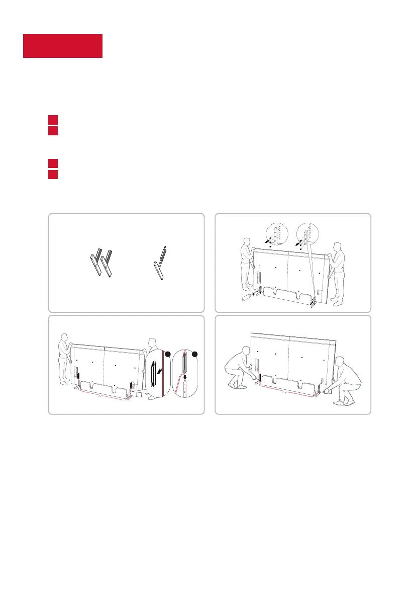 people securely hold the TV upright, another person should install the stands. Make sure