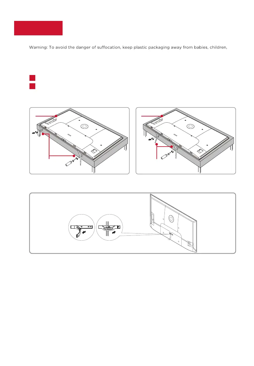 Open the cable clip on the back of the TV and route the cables as illustrated.
