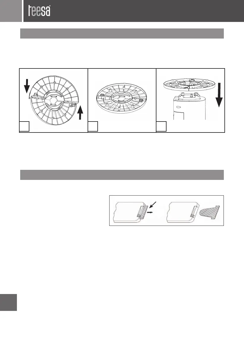 2. Fixați baza în partea de jos a ventilatorului și rotiți-o conform săgeților de pe bază până