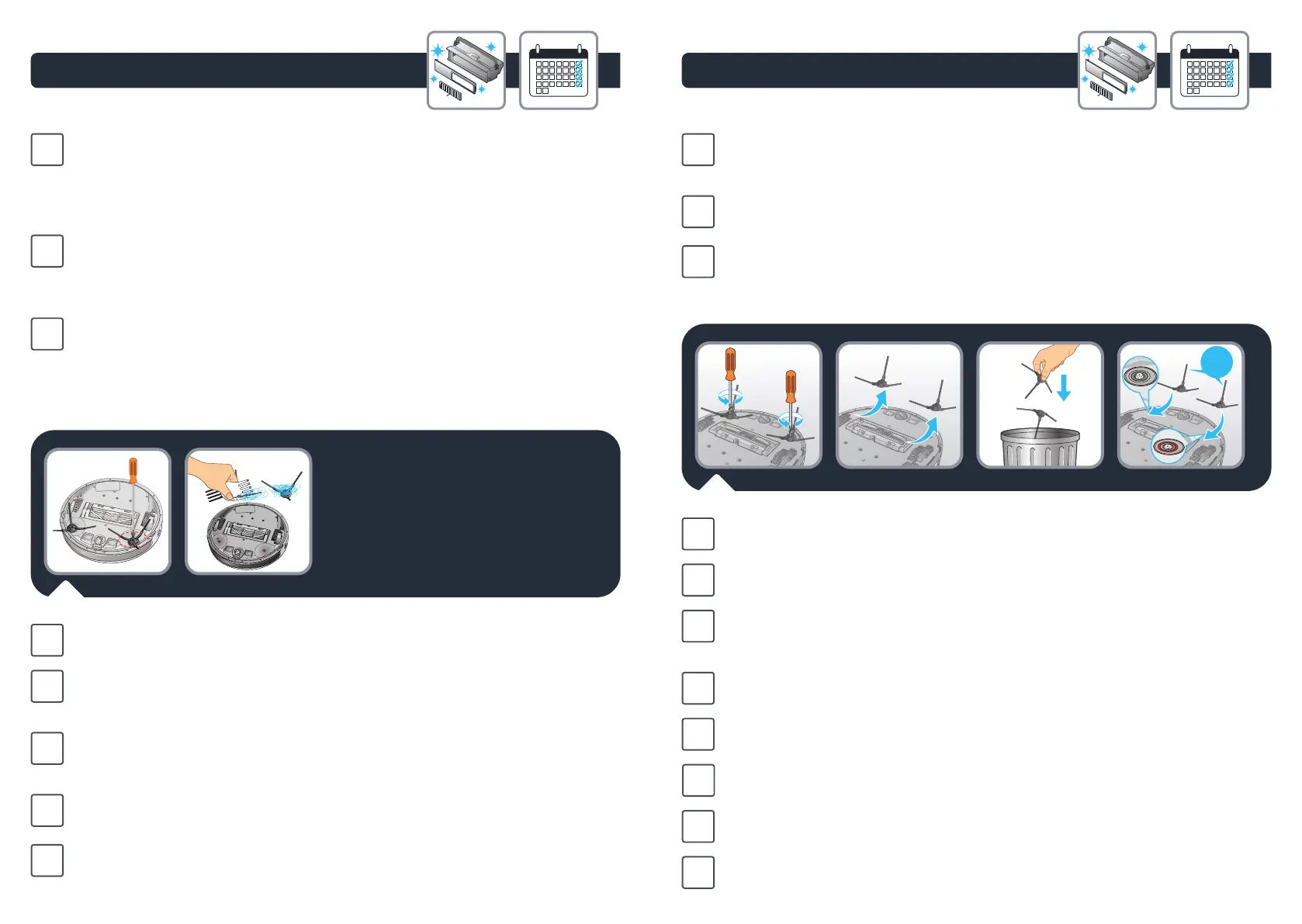 Išmeskite senas šluoteles ir pakeiskite jas naujomis. Prie roboto prisukite naujas šluoteles.