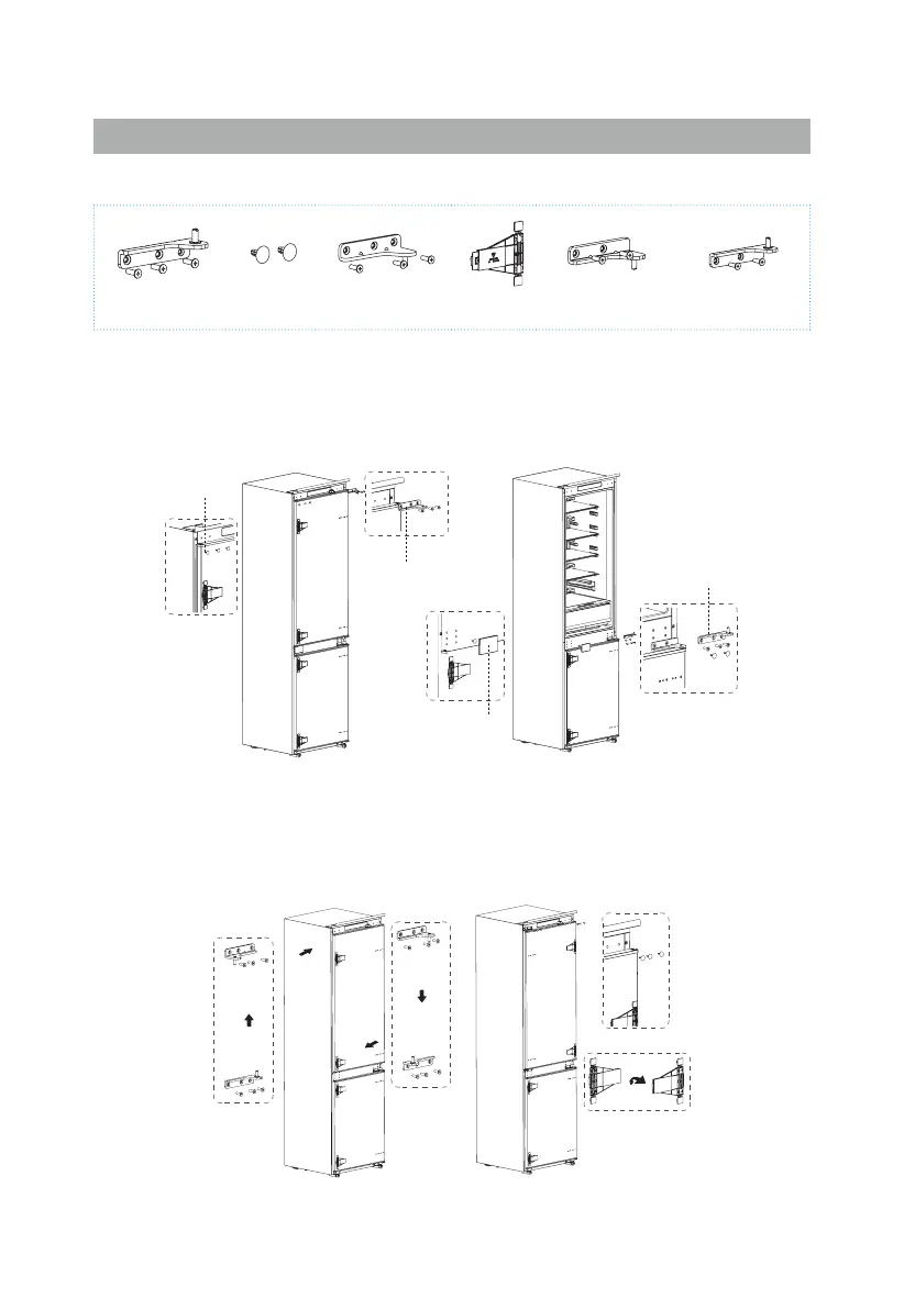 5. Retire los dos bloques fijos de la puerta del frigorífico, gírelos 180° e instálelos en el otro lado de la puerta