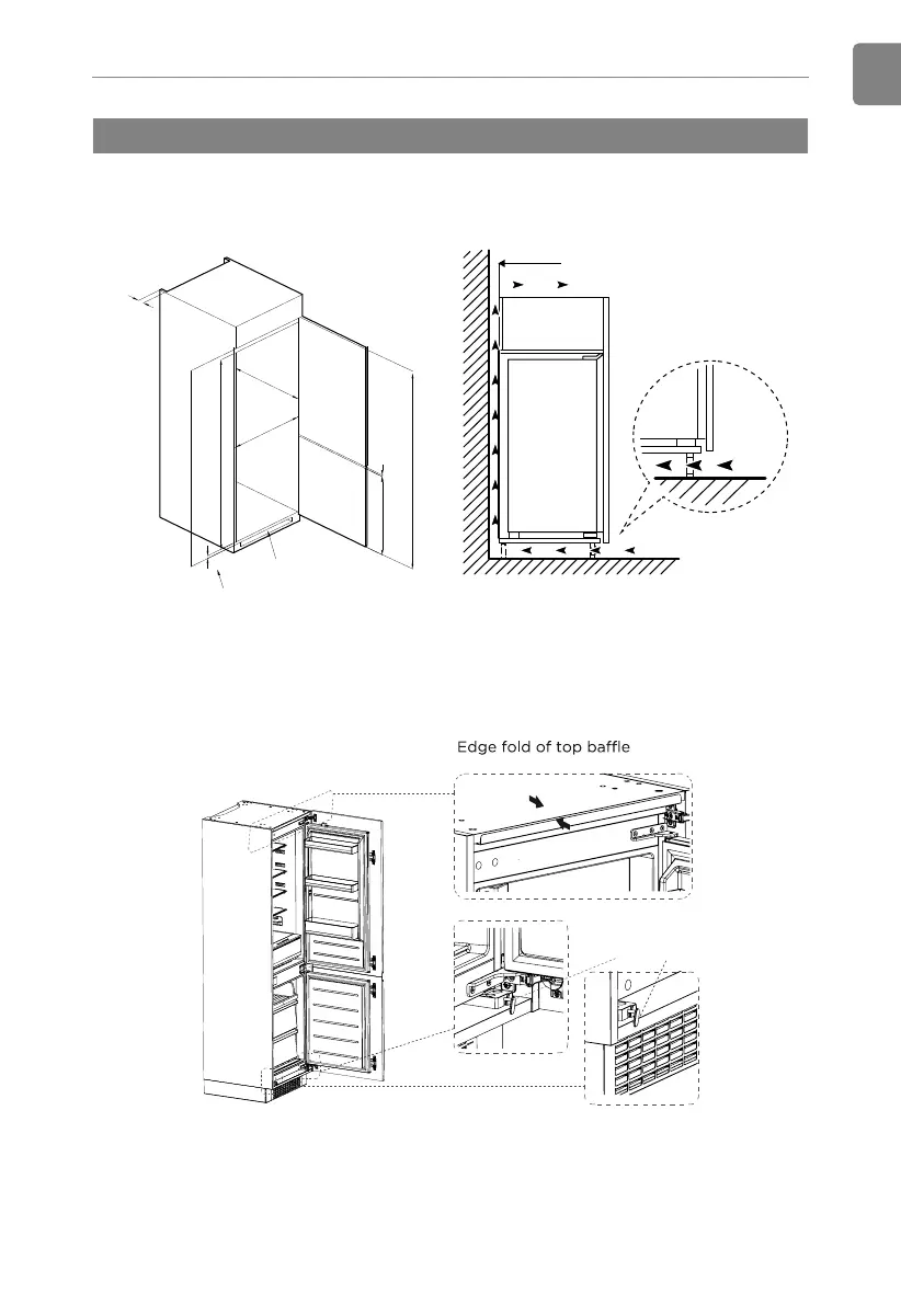 2. Push the refrigerator into the cabinet and adjust it to make sure the edgefold of top baffle