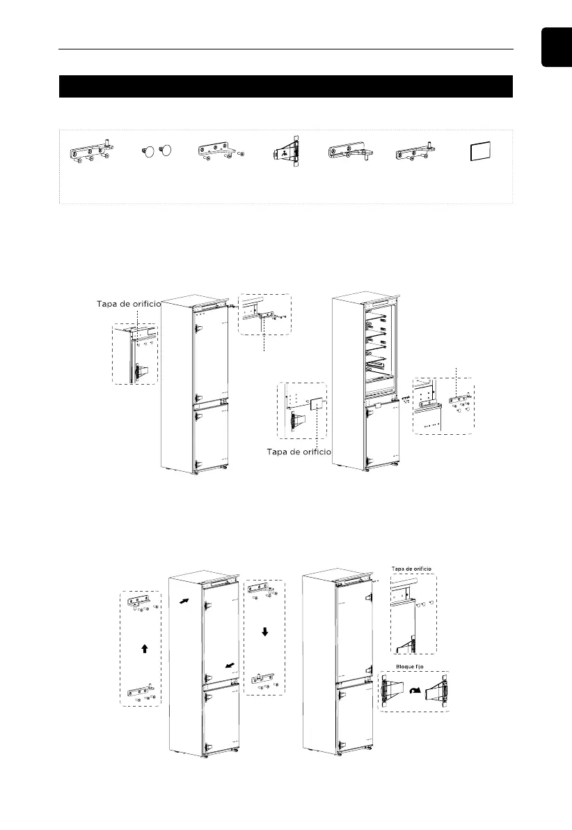 5. Retire los dos bloques fijos de la puerta del refrigerador y gírelos 180° e instálelos en el otro