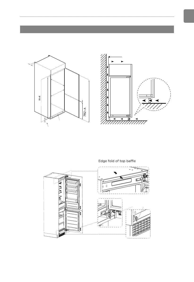 2. Push the refrigerator into the cabinet and adjust it to make sure the edgefold of top baffle