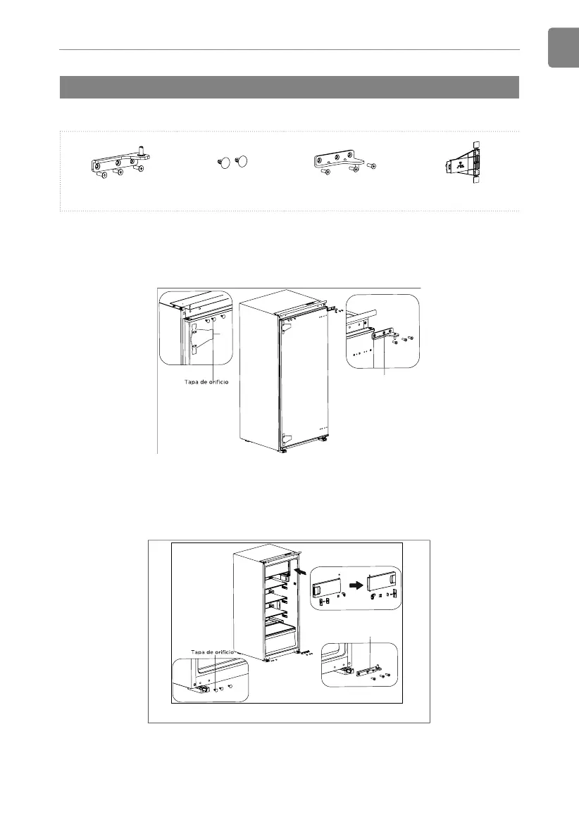 2. Retire la bisagra superior y las tapas de los orificios de la puerta del refrigerador.