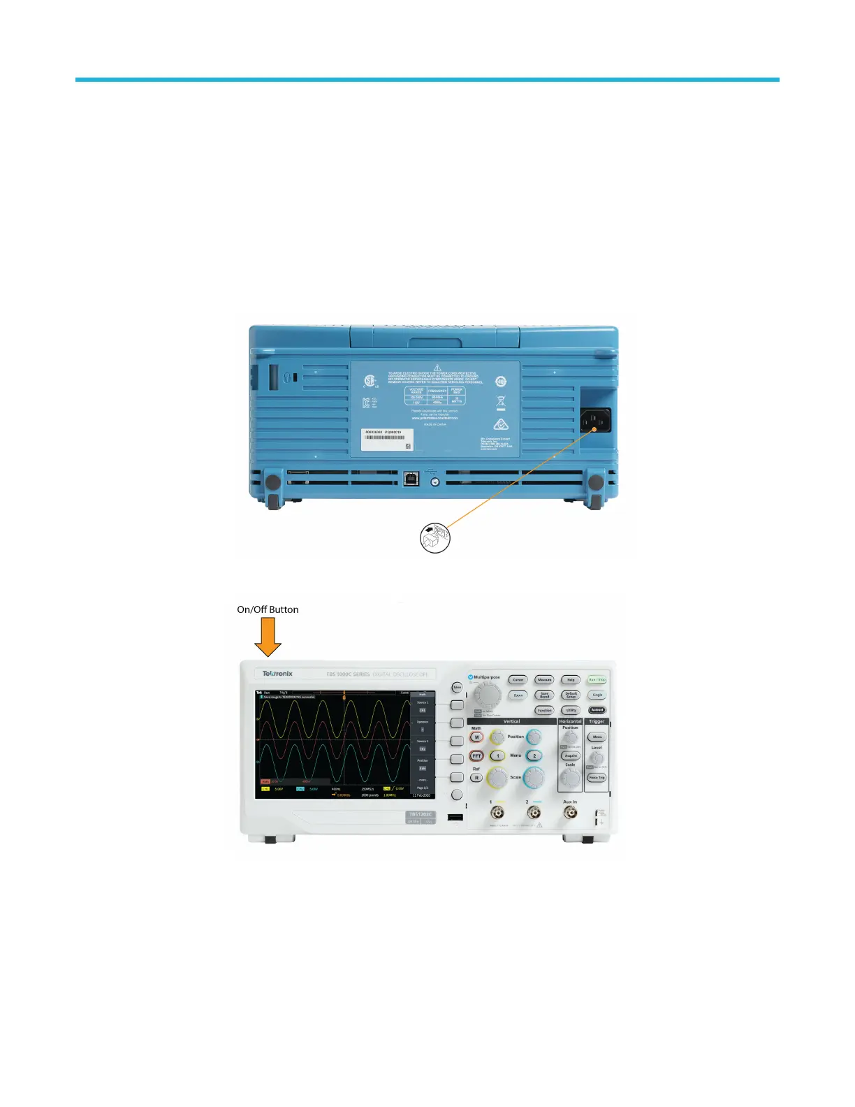 1. Connect the power cord supplied with the instrument to the oscilloscope power connector.