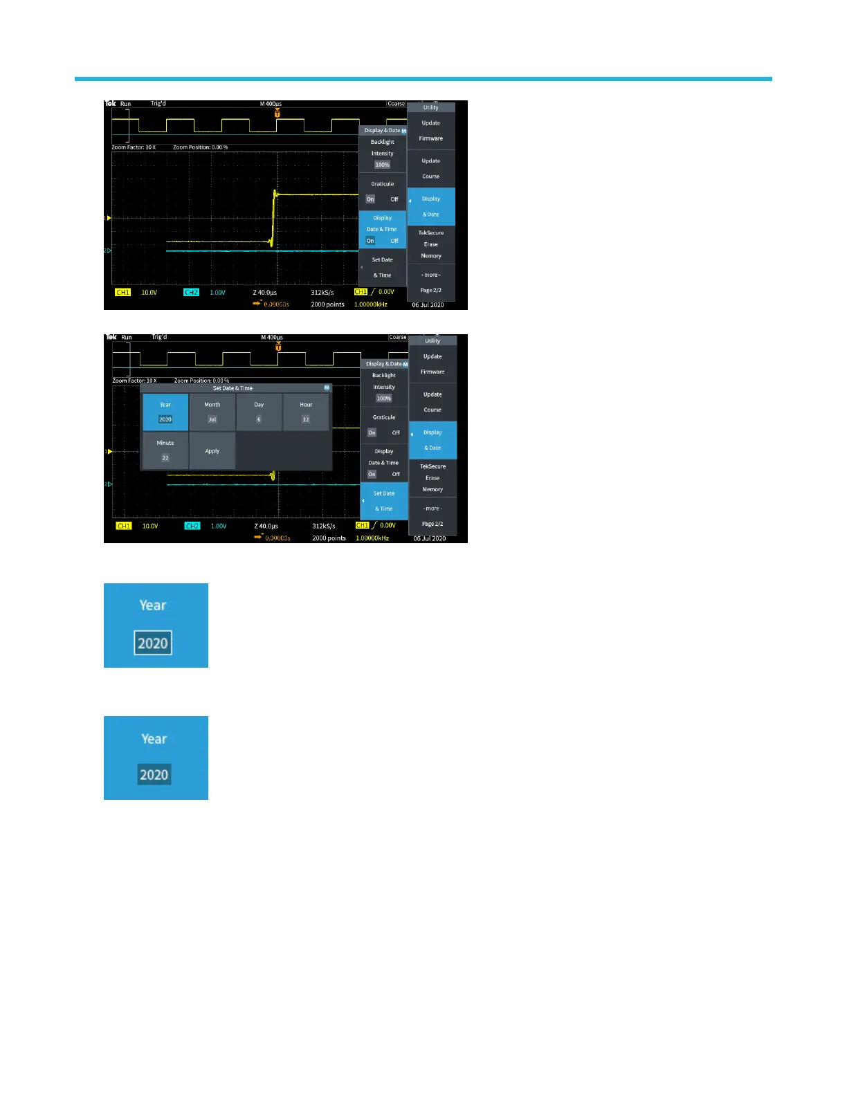 7. Repeat steps 2 - 5. to select and change the remaining date and time settings (Month, Day, Hour, Minute).
