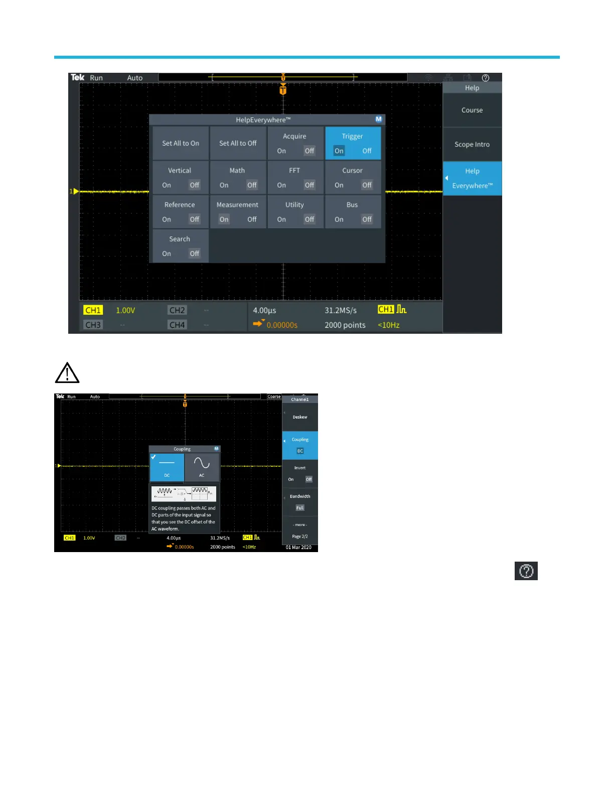 The next time you access a HelpEverywhere™ supported menu setting, the oscilloscope displays the help for that item.