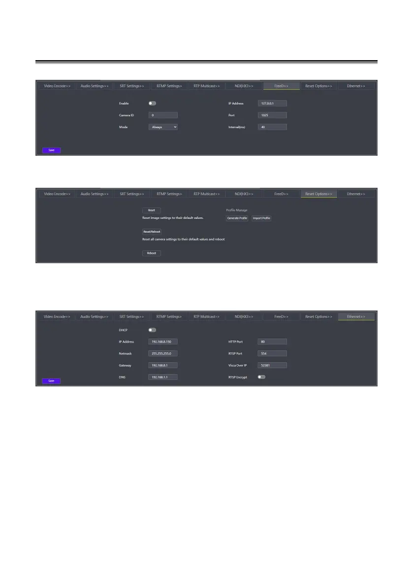 switch, IP address, net mask, gateway, HTTP port, RTSP port, Visca over IP port,
