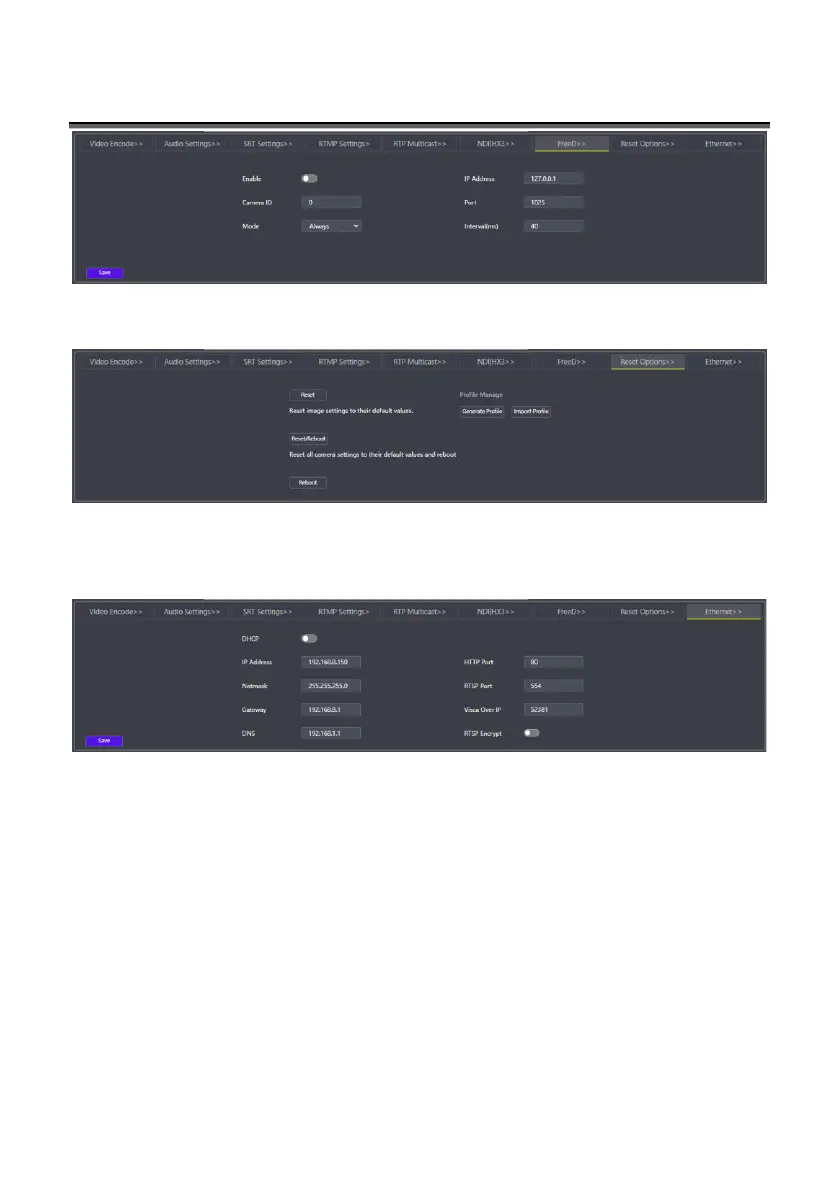 IP address, net mask, gateway, HTTP port, RTSP port, Visca over IP port, RTSP