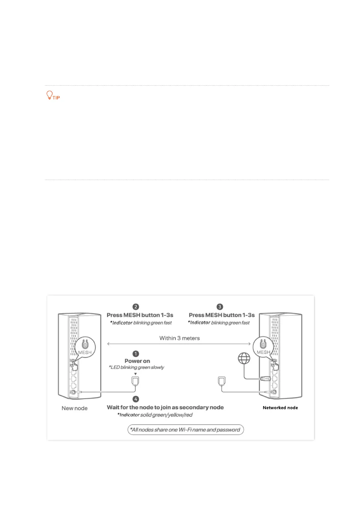 2. Press (1-3 seconds) the MESH or WPS button on the new node, and its indicator blinks fast.