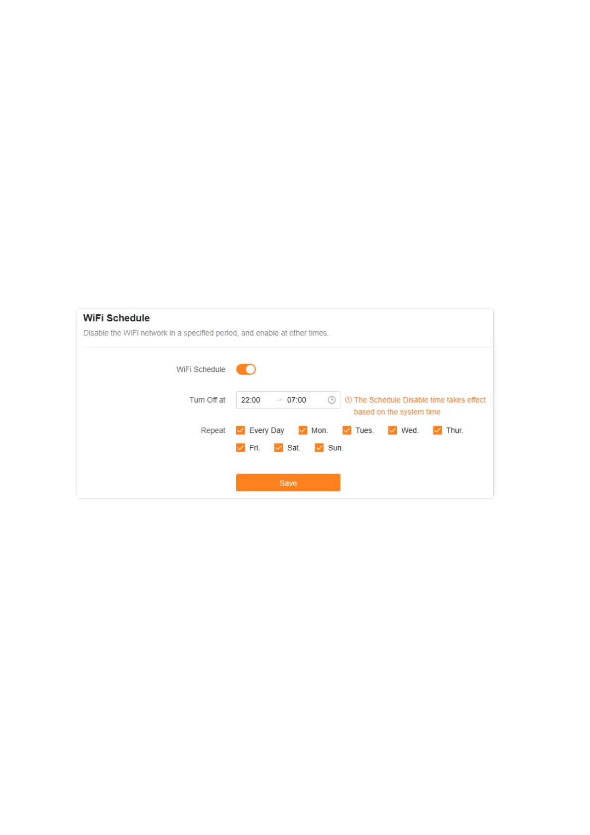 6. Set Turn Off at to the period during which the Wi-Fi network are disabled, which is 22:00 –