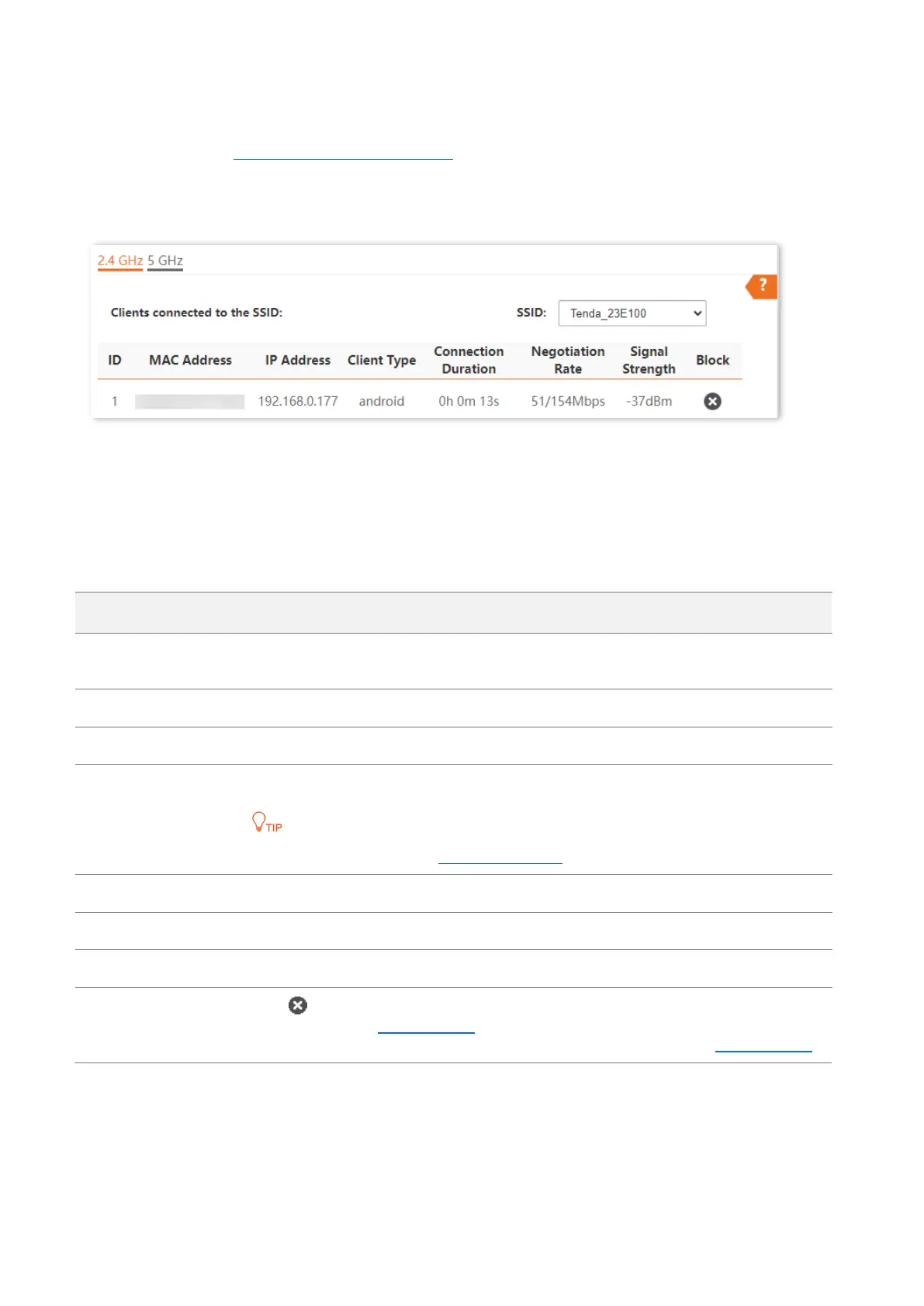 By default, the page displays information about the wireless clients connected to the 2.4 GHz