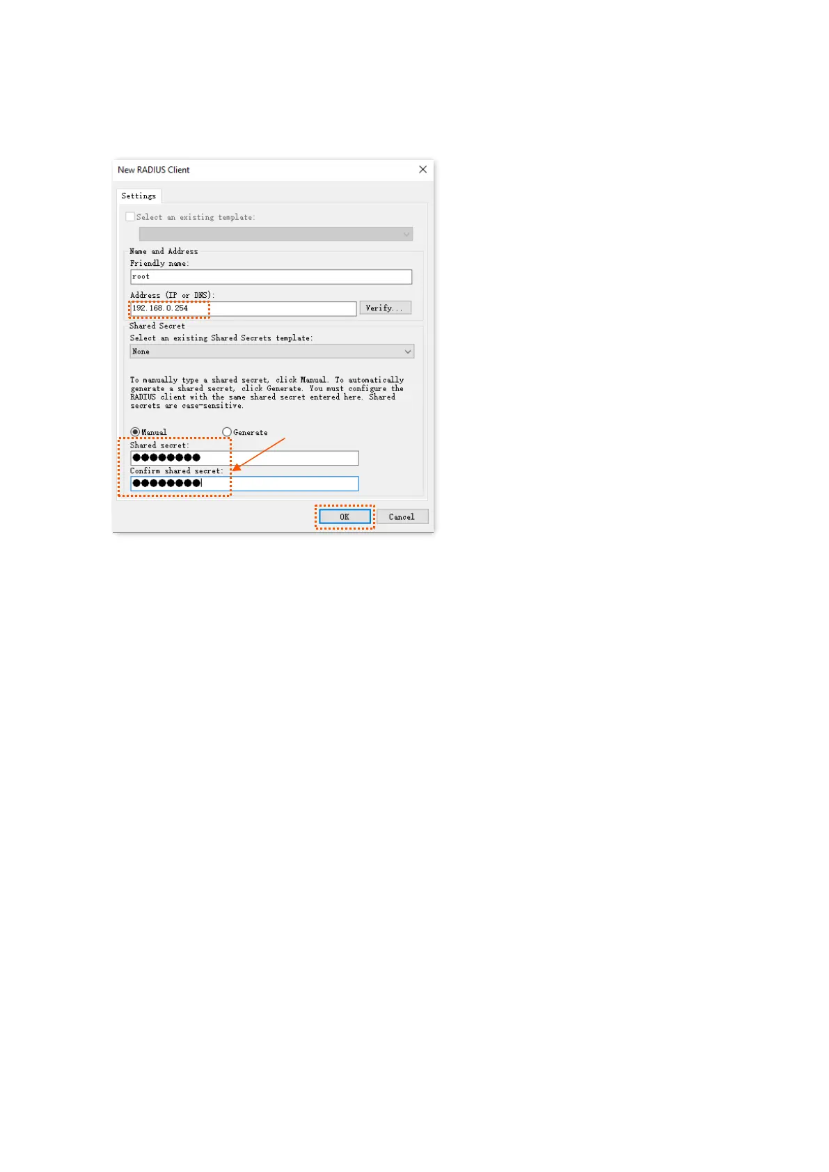Enter UmXmL9UK in the Shared secret and Confirm shared secret text boxes, and click