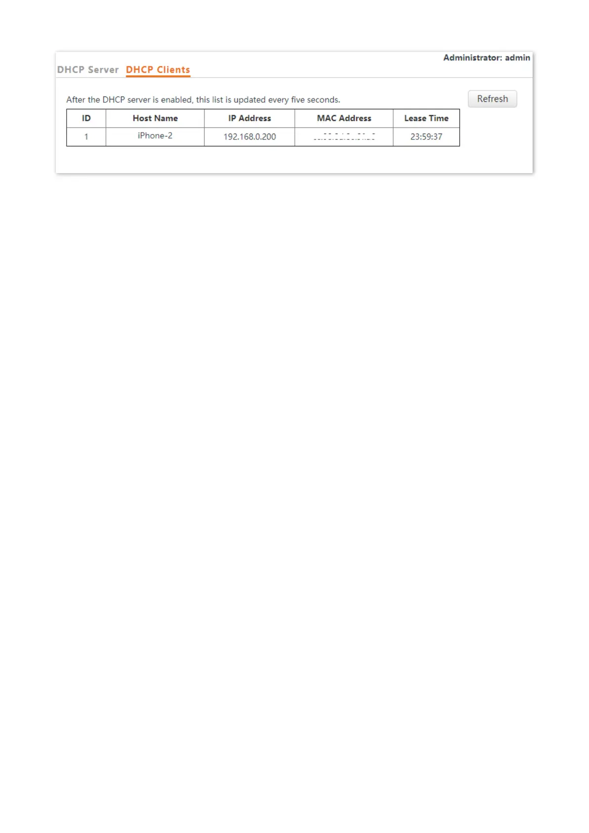 To view the latest DHCP client list, click Refresh.