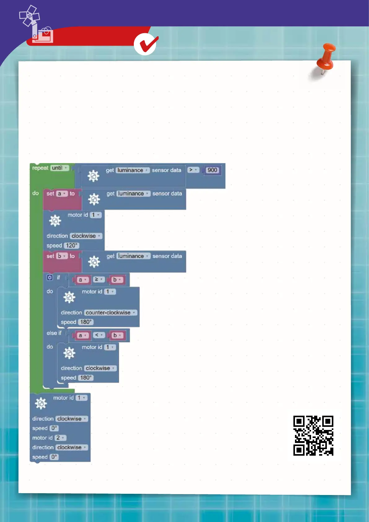 Code menu. After testing out this program, try modifying it so that the light-tracking robot rotates away from the