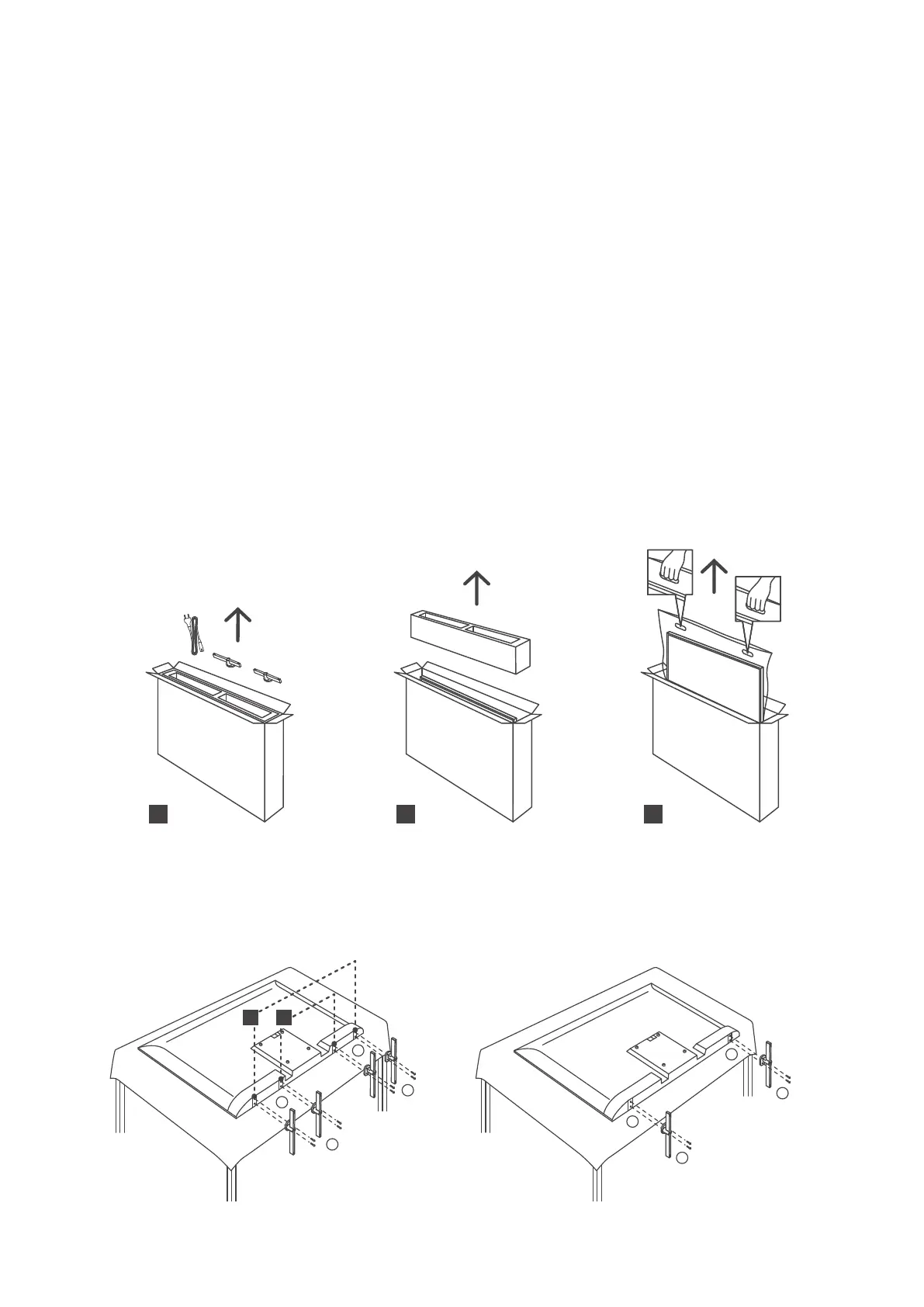 Take out the feet and the TV from the packing and put the feet onto a table or any other even surface.