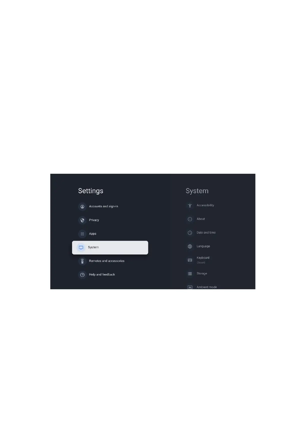Gebruik de richtingstoetsen om de opties Over, Datum en tijd, Taal, Opslag, Energie en andere te