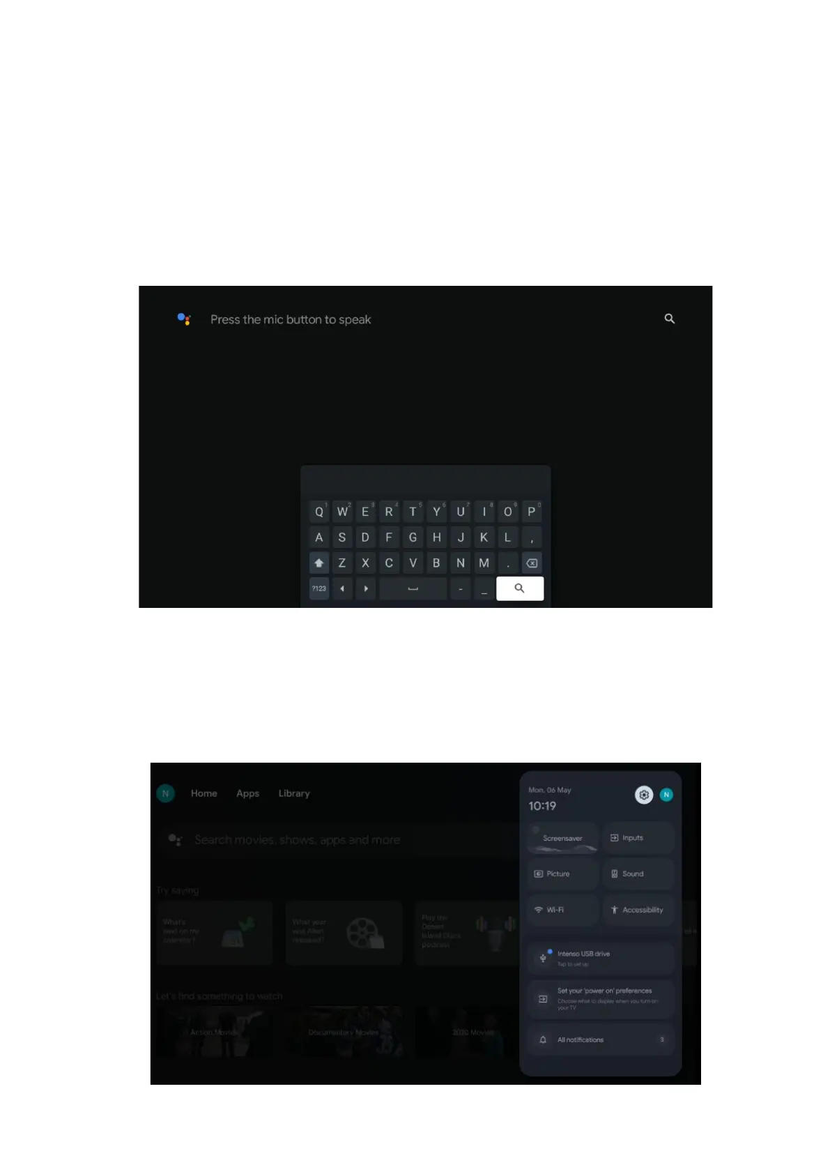 Keyboard search – Select the search bar and press OK. The virtual Google keyboard will appear