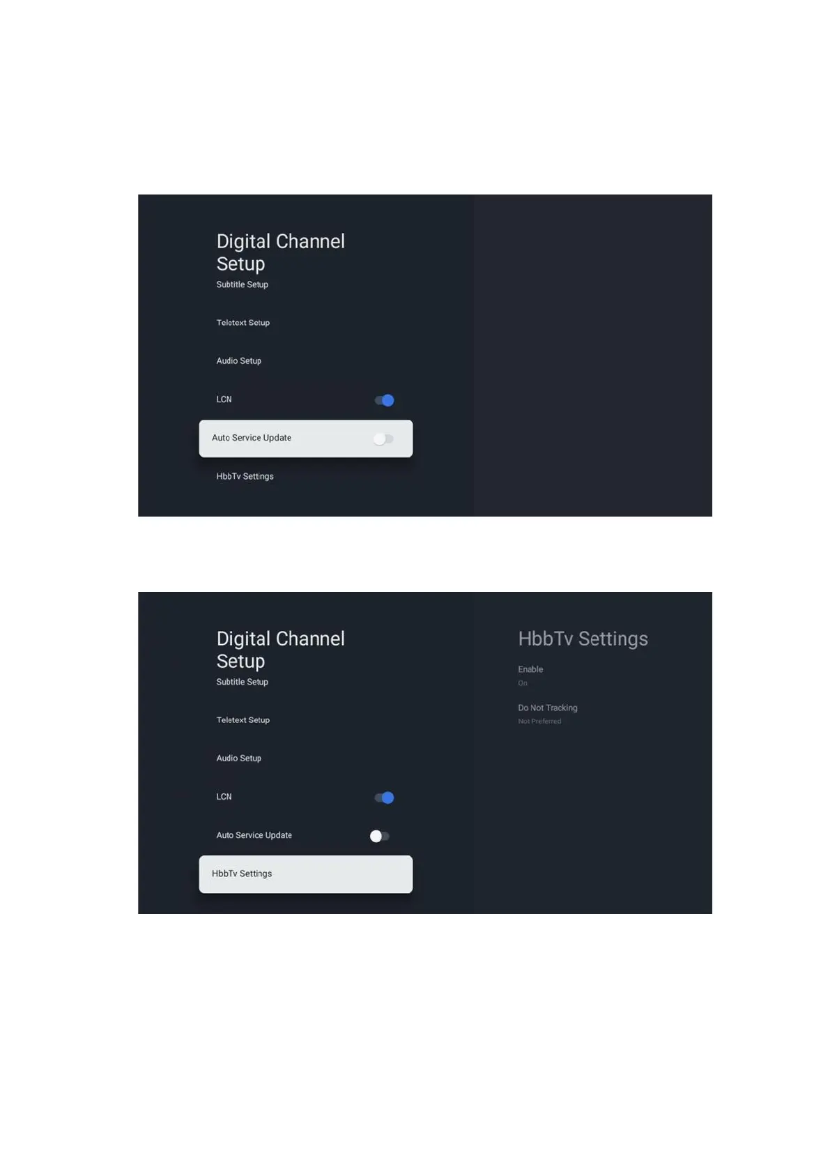 • Do Not Tracking: When it is On, it disables tracking on channels with the HbbTv feature.