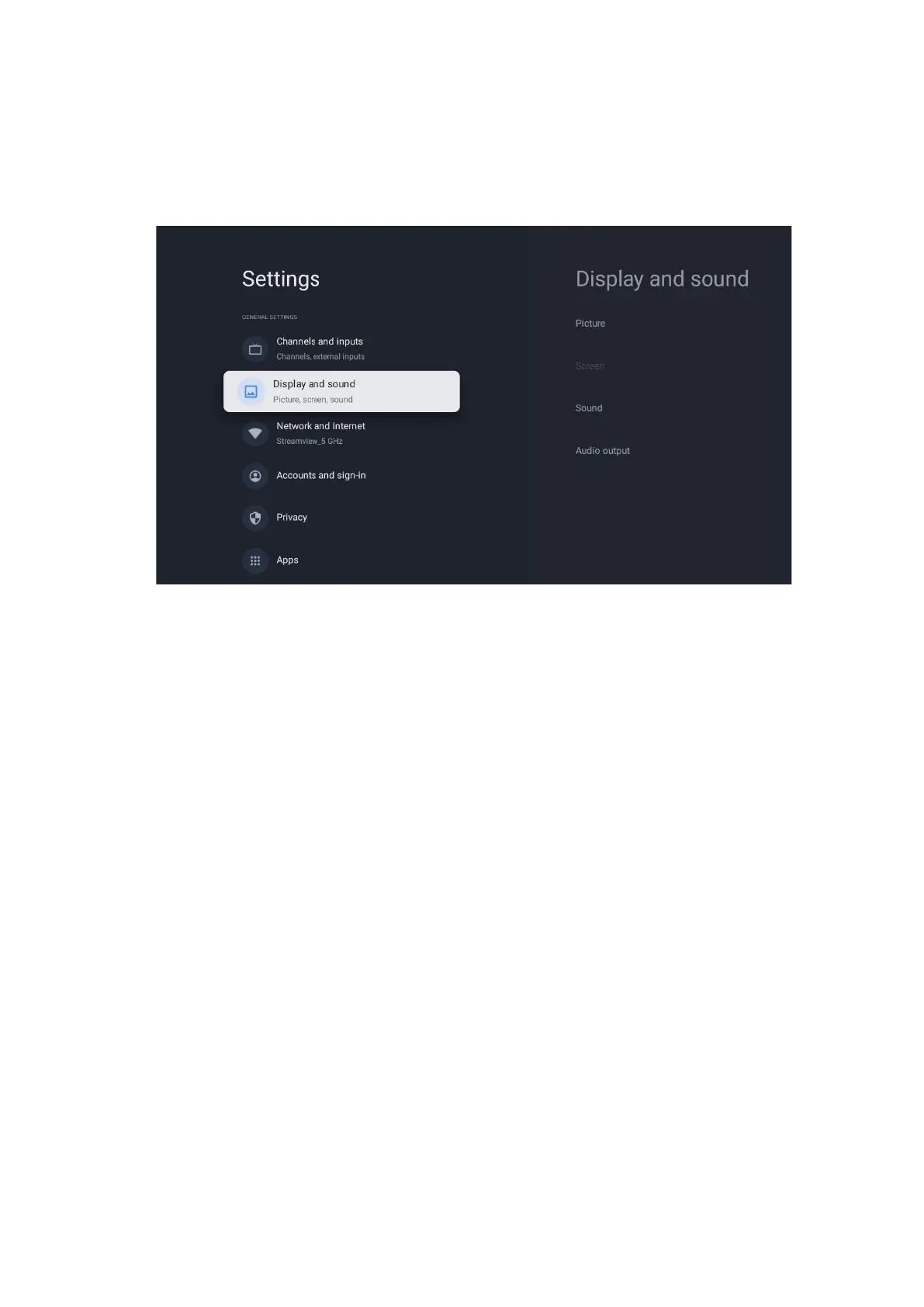 Adjust Picture, Screen, Sound and Audio output settings. Use the directional buttons to select