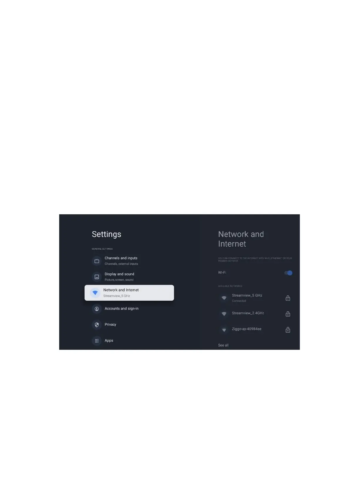 and press OK to see all networks. Select one and press OK to connect. You may be asked to