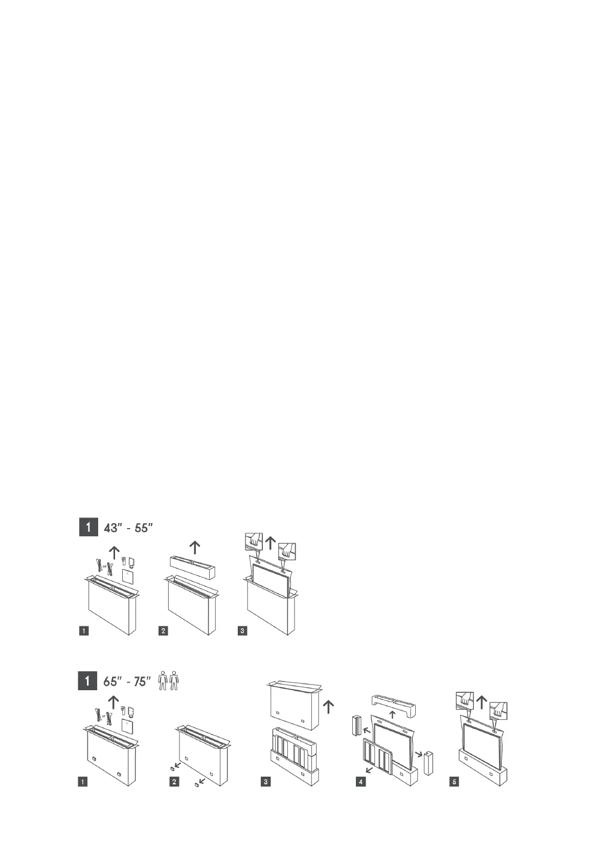 Take out the feet/stand and the TV from the packing and put the feet onto a table or any other