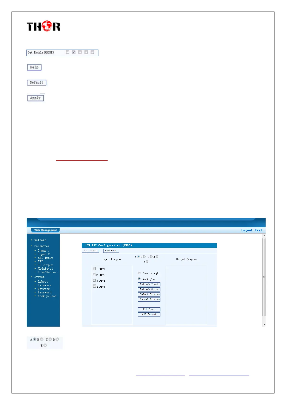 You can choose the output program from 4 carriers (A, B, C, D) or ASI(E).