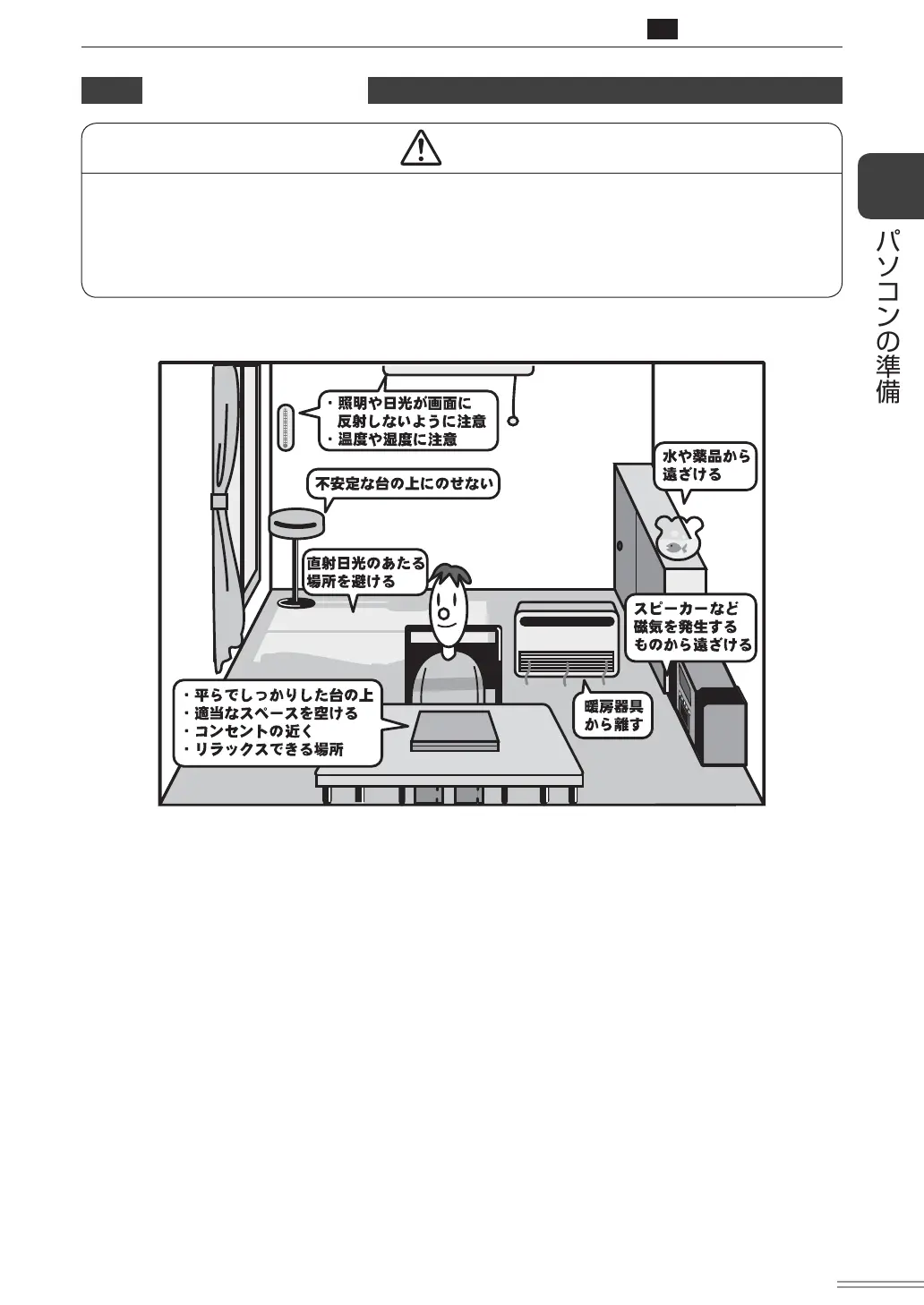 不安定な場所に置くと、パソコンが落ちたり倒れたりするおそれがあり、故障やけがにつな