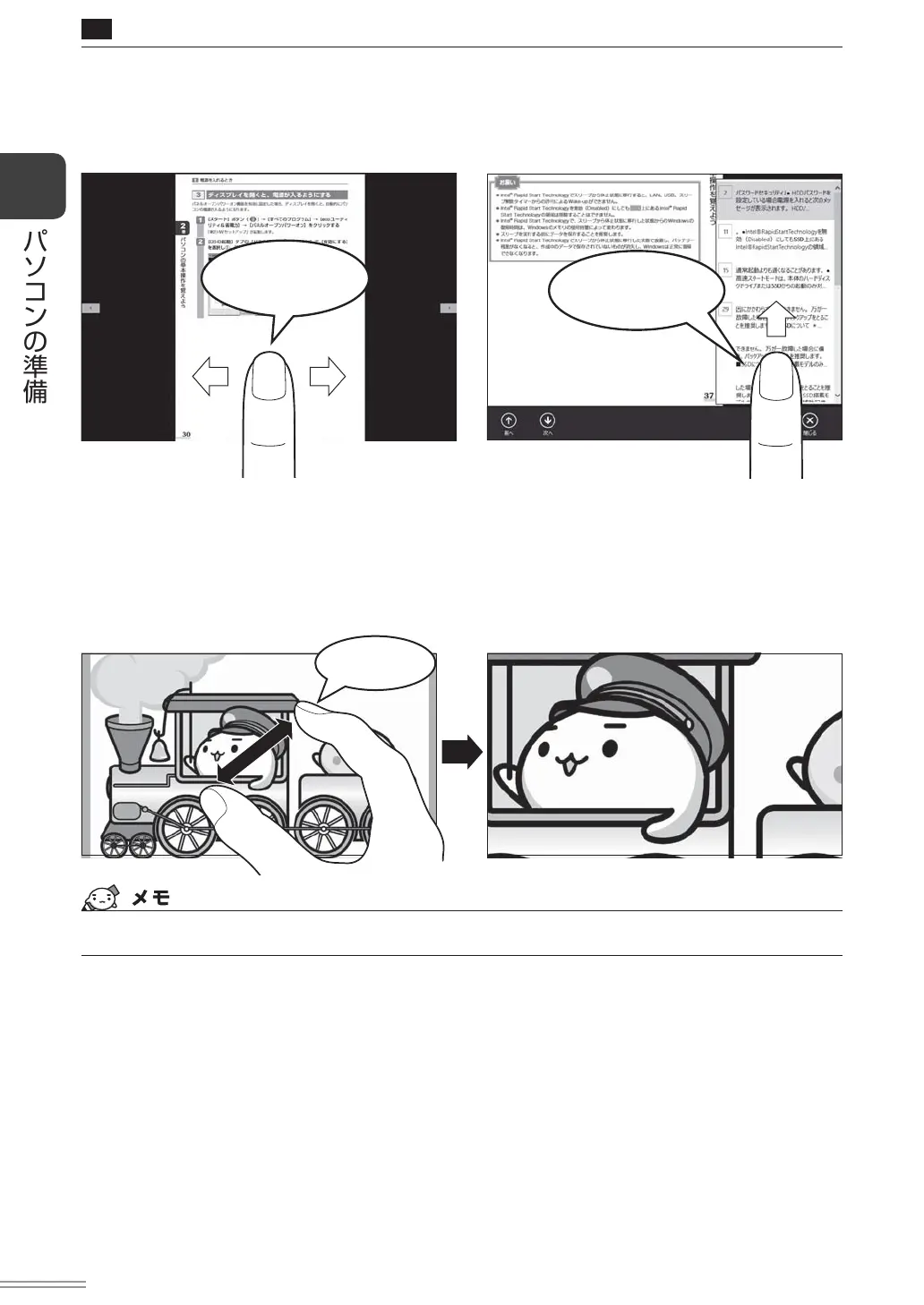 画面に指を置き、画面を軽くはらうように動かしたり(スワイプ)、なぞったり(スライド)します。