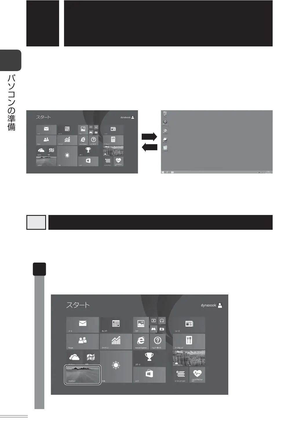 スタート画面とデスクトップ画面の切り替えかたについて説明します。