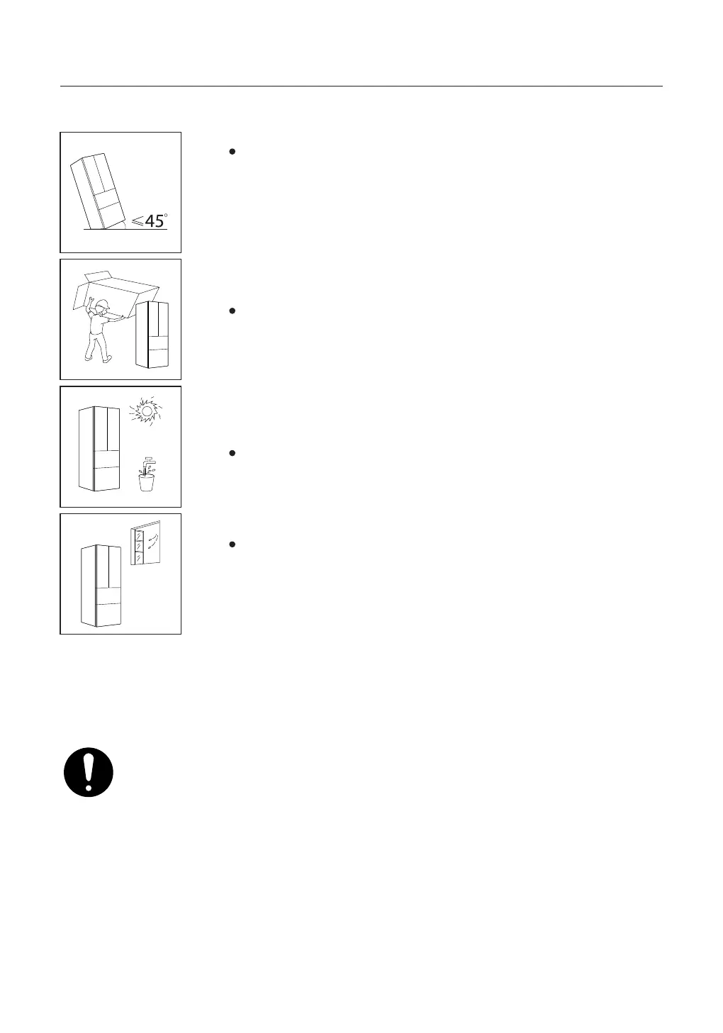 Jangan sembur atau basuh peti sejuk; jangan letakkan peti sejuk di