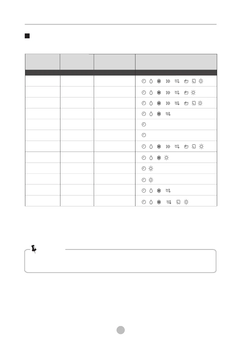 • The table shows which cycle offers which options for adjustment.