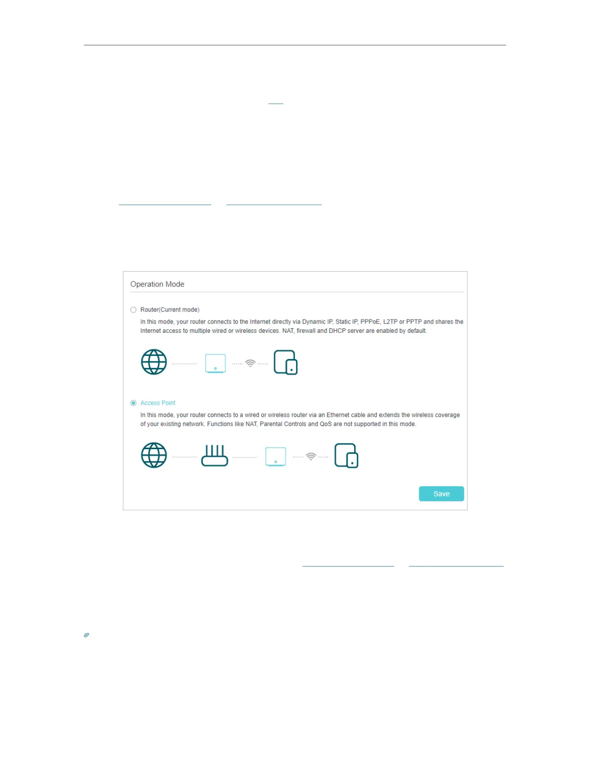 2. Go to Advanced > Operation Mode, select Access Point and click Save. The mesh