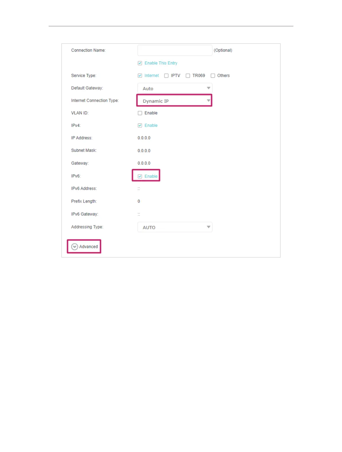 3 ) PPPoE(SLAAC/DHCPv6/AUTO/Passthrouth): Click Advanced to input further