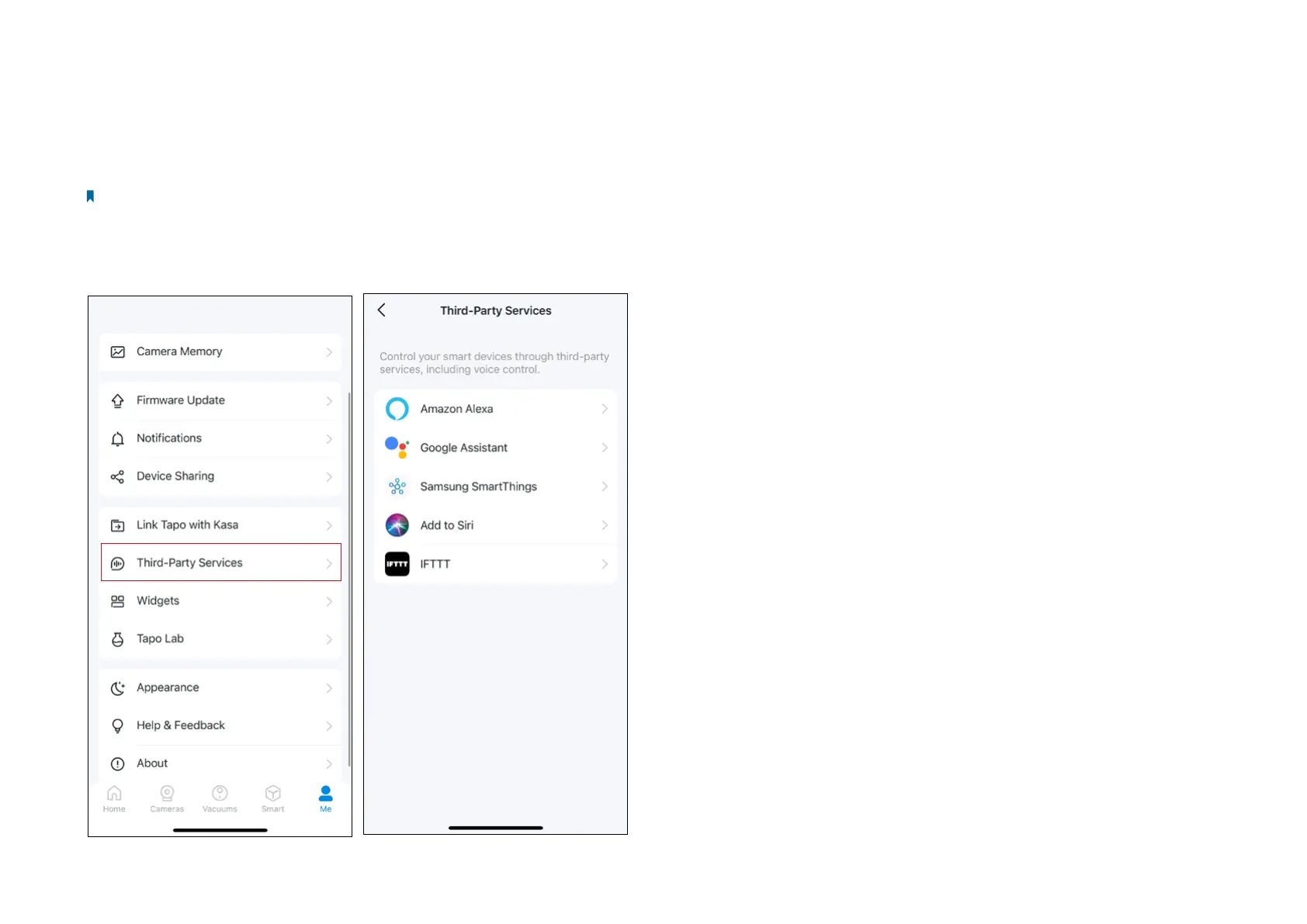 Launch the Tapo app. Go to the Me page and tap Third-Party Services. Choose Amazon Alexa or Google Assistant and follow the app instructions