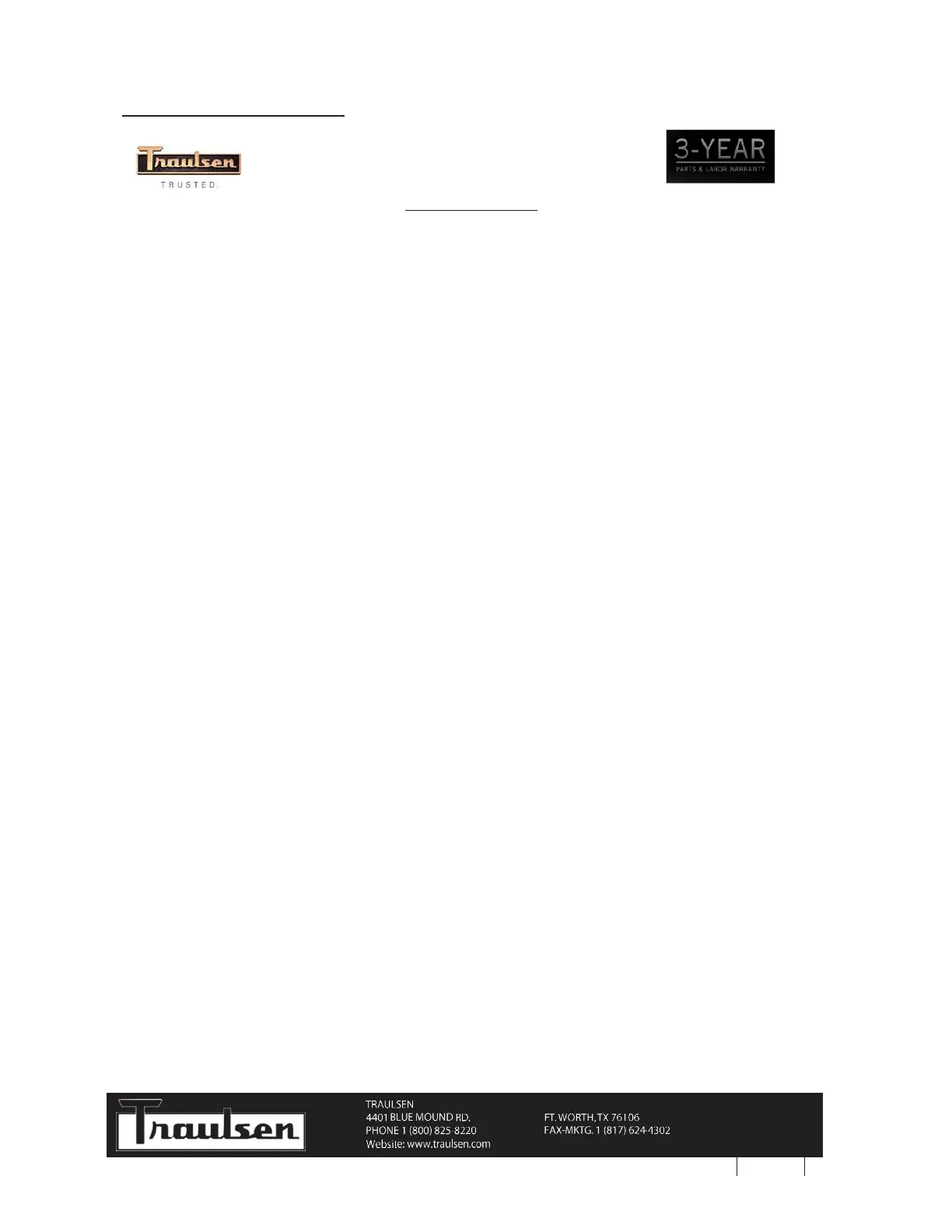 TRAULSEN EQUIPMENT WARRANTY