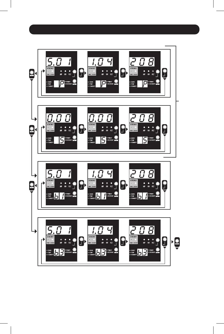 Note 1: Press Mode button to go to the next Display mode (vertical movement on this document). Note the Amps, kW or Volt sub-
