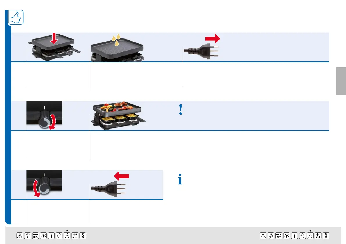 Ne jamais poser les coupelles ou la spatule utilisés sur la plaque de gril – Les restes d’aliments brûlent.