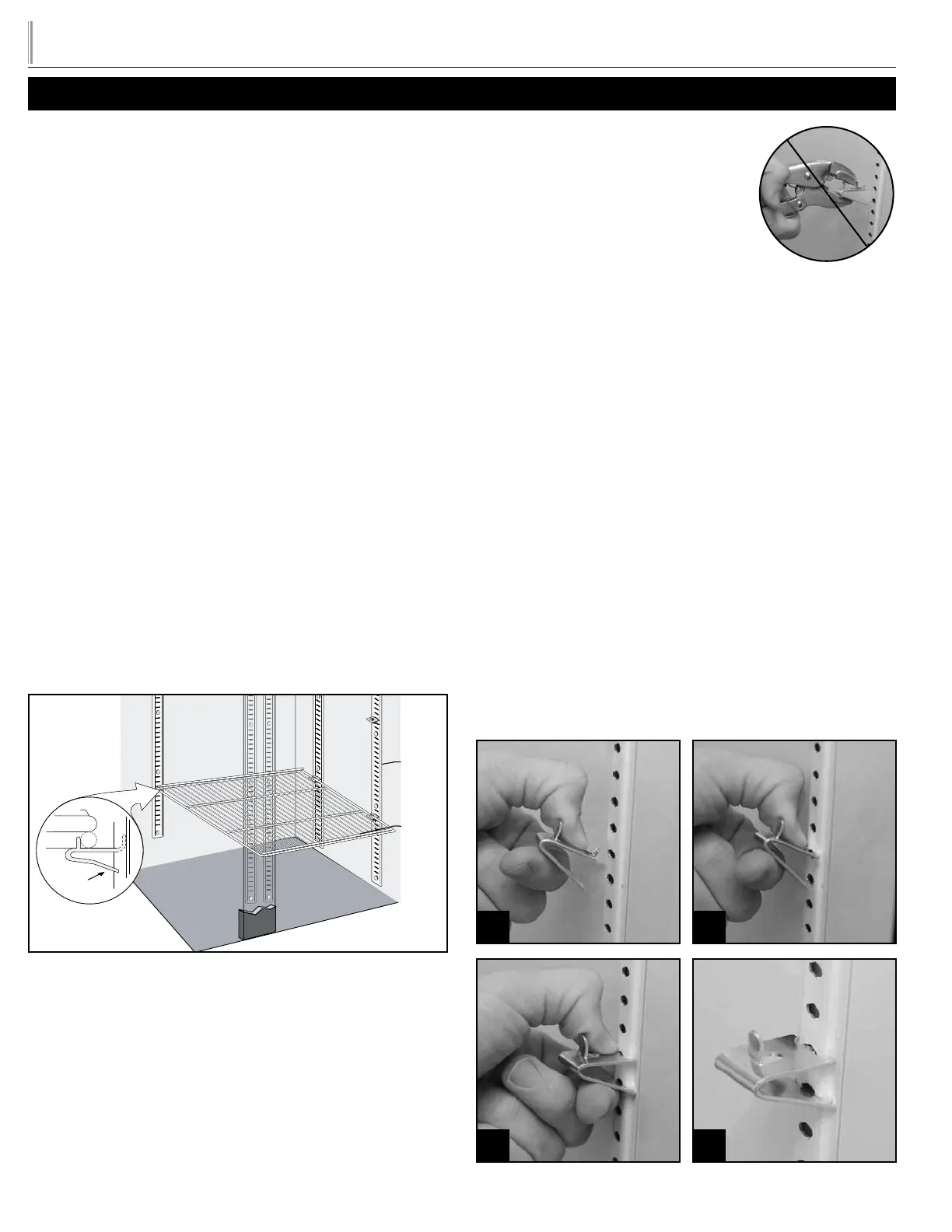 Install the top tab of the shelf clip into the proper hole. Push up on