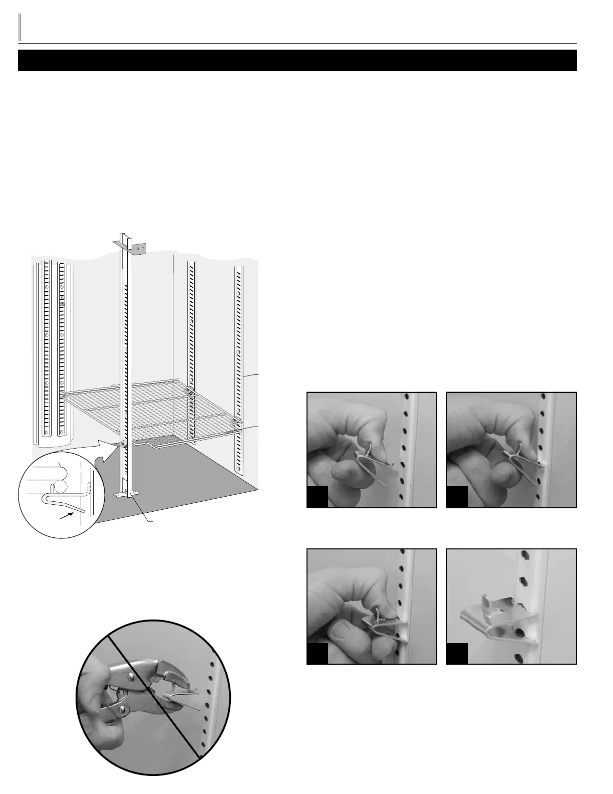 Install the top tab of the shelf clip into the proper hole. Push up on